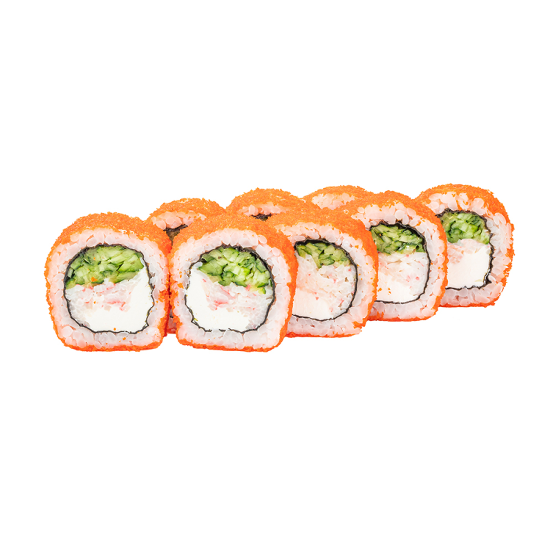 Рис, норі, крем-сир, крабові палички, огірок, кранч, майонез.