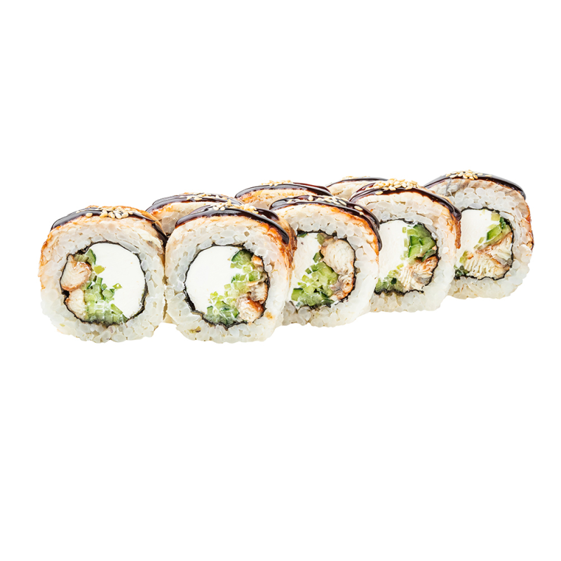 Рис, норі, вугор, крем-сир, огірок, кунжут, соус унагі.